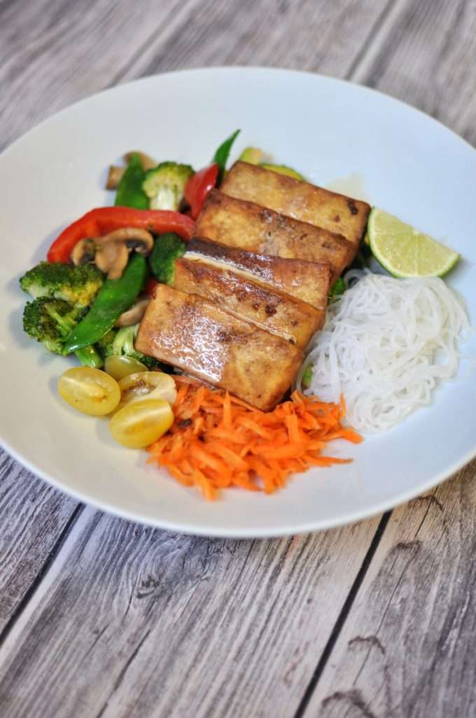 - Pour over the vegetables to a bowl or plate. Serve your Asian bowl with tofu, shredded carrot and shirataki noodles.